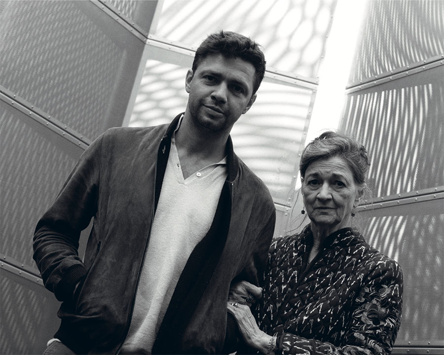 Conrad Shawcross is no stranger to public space. Last year, his The Interpretation of Movement (a 9:8 in blue) (2017) stretched across the lofts of St Pancras Station, while his lauded architectural intervention The Optic Cloak (2016) towers 49 metre high above North Greenwich: a monolith of moire effect, perforated aluminium panels. Little surprise, then, that the artist’s Optic Labyrinth (Arrangement I) (2018) is a stand out of this year’s Frieze Sculpture – a free exhibition of outdoor art selected by Claire Lilley (YSP), sited a stone’s throw from the fairs – which coincides with Conrad’s show at Victoria Miro Mayfair in Frieze Week. Fortress-like from a distance, Labyrinth’s manipulation of moire optics means its whole form throbs and shimmers, inviting viewers to navigate the sculpture in all dimensions. During the photograph, this engagement was eagerly undertaken by Conrad’s son Hartley, under the eye of his Nonna, Marina Warner. A writer of criticism, essays, and fiction, Marina’s works – many of them landmarks in their field – examine the powers inherent in the stories we tell, from legends of female heroism to the Arabian Nights, fairy tales and lullabies to Ovid. One of our leading public intellectuals, last year she was elected President of the Royal Society of Literature. Marina’s latest book, Forms of Enchantment: Writing on Art & Artists (Thames & Hudson), makes ideal reading for Frieze Week, gathering thirty years of her thinking on artists including Louise Bourgeouis, Damien Hirst, Joan Jonas, Sigmar Polke and Kiki Smith.